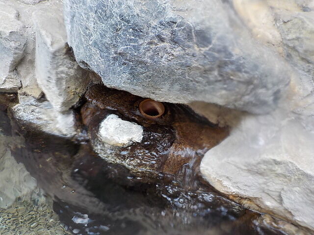 無色透明の岩風呂。湯口から循環湯が約20ℓ分注いでいる。循環吸込み口から湯が吸い込まれている。つるすべの欲感有り。