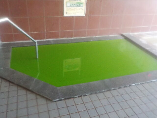 無色透明の湯。壁面から湯が落水している。カルキ臭あり。側壁に循環吐出口3ヶ所と循環吸込口3ヶ所確認。湯底にも2ヶ所目皿付き湯孔があるが、湯縁からのオーバーフローがないので、循環戻り口の可能性がある。つるすべの浴感あり。
