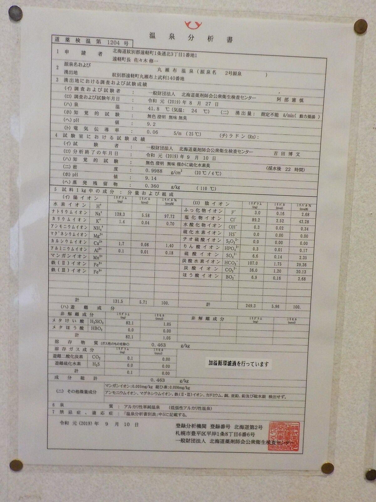 令和元年9月10日に作成した温泉分析書(北海道薬剤師会公衆衛生検査センター)。泉温:41.8℃(気温:24℃)、湧出量:測定不能 ℓ/分(動力揚湯)、pH値:9.2、溶存物質:0.463g/kg、成分総計:0.463g/kg、