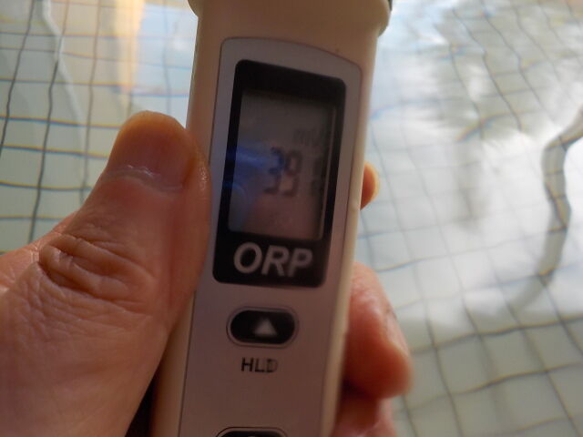 2020/3/15、14時~14時20分、浴槽内でORP計測。加温循環ろ過方式で、塩素系薬剤使用。