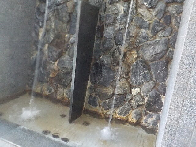 打たせ湯が2条落水している。温泉だが、加温循環ろ過方式で、塩素系薬剤使用。