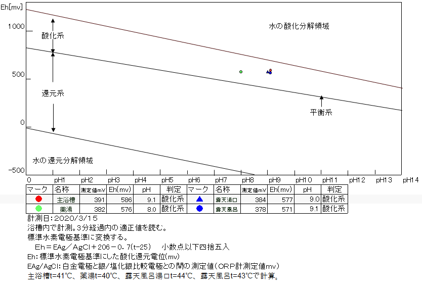 塩素系薬剤使用でいずれも酸化系に有る。主浴槽、露天風呂は本来還元系であるべき温泉としての特性が失われている。