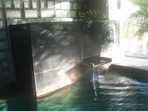 タイルが青いので青く見えるが、ほとんど無色透明。湯口から42.7℃、pH6.1の湯が注ぐ。知覚的には微弱塩味、ほとんど無臭。