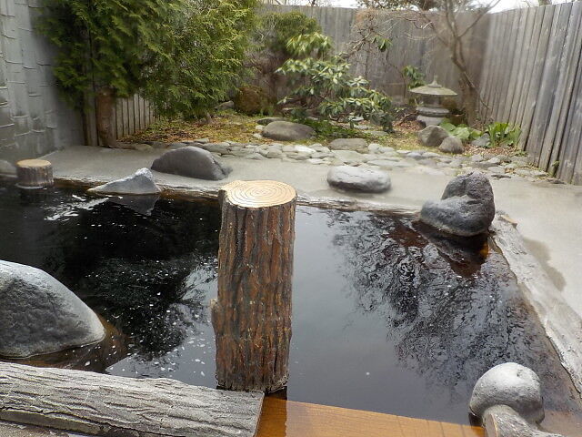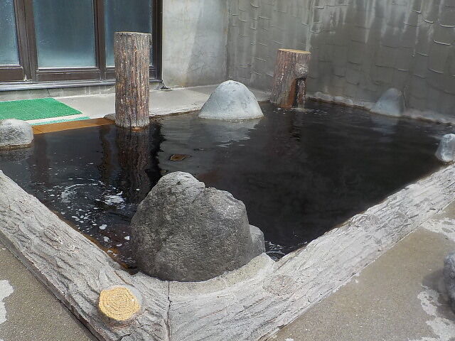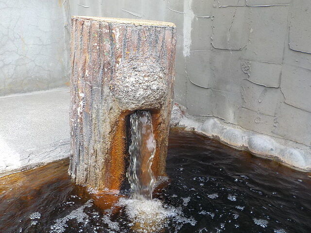 不透明のコーヒー色。木を模した湯口から約30/ℓ分注湯。知覚的には内風呂に準ずる。湯の表面に白い気泡が浮いている。溢れた湯は湯縁からオーバーフローしている。1分経つと肌にうっすらと気泡が付着する。モール重曹系のぬるりとした浴感あり。