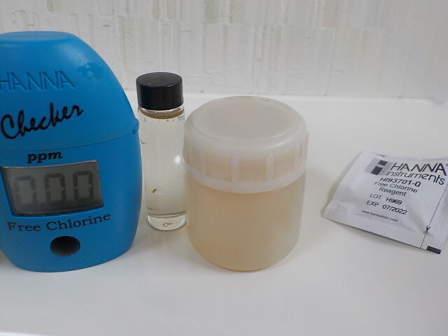 2021/5/5、12時頃、主浴槽で試料をミニボトルで採取し、遊離残留塩素測定器で遊離残留塩素濃度を測定。