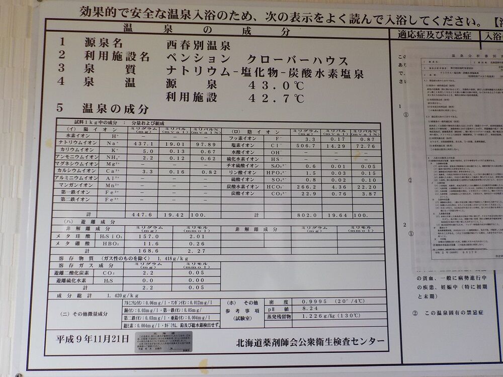 国道243号線沿いにある温泉付きのペンション。牧場跡で平成6(1994)年に掘削を始め、翌年、深度1,116mで温泉掘削に成功。平成13(2001)年11月、苦難を乗り越えて「ペンション クローバーハウス」の開業にこぎつけた。当時の看板は西春別温泉となっていた。