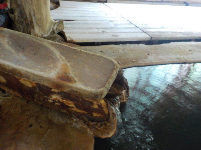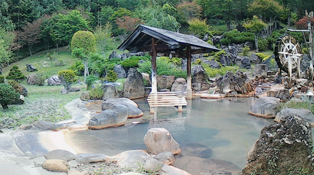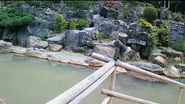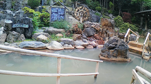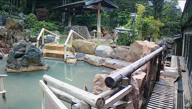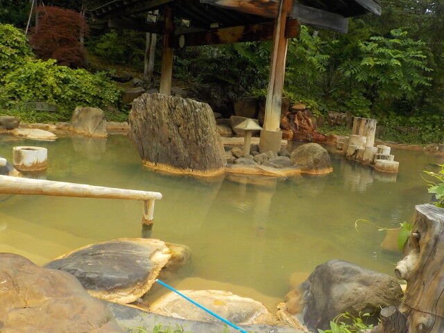 森を背景に周囲を大きな岩を配置して木彫りのふくろうも置いている。黄緑色の濁湯で半透明の湯。水深は約60cmと浅め。暑い日は水車が回って温度調整をしている。溢れた湯は排湯口から排湯している。かなり広いので自分好みの場所と湯温を歩いて捜すことができる。
