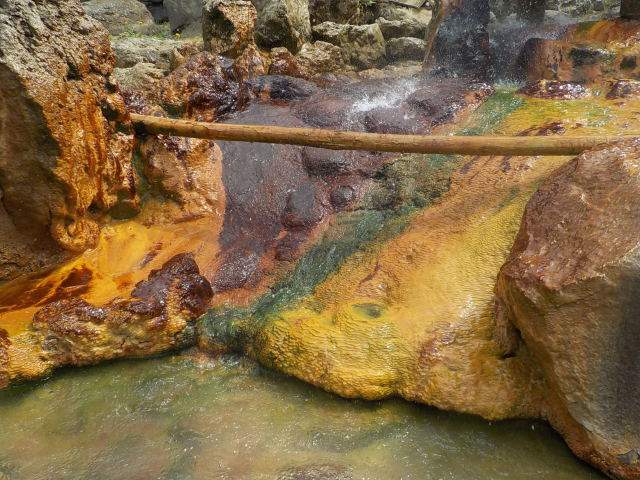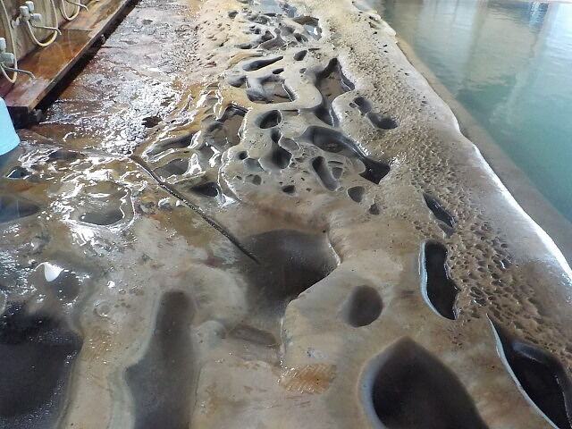 千枚田状態の幾何学文様の床は析出物によって出来た石灰華。歩くと足裏が痛い。