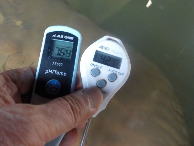 湯口:温度48.6℃、pH6.56、ORP値は-47mvに収束した。