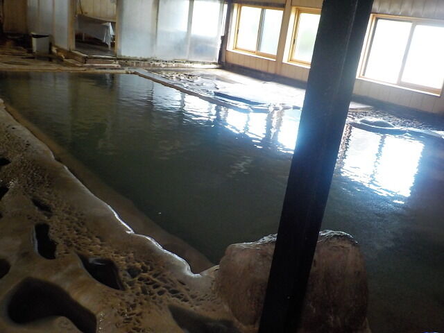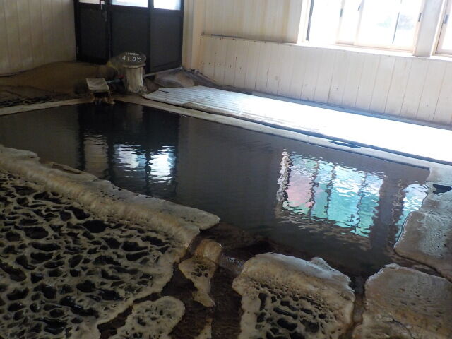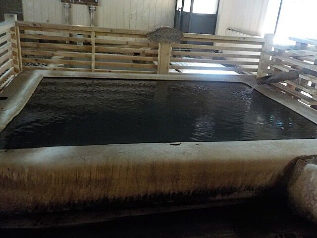 笹濁りで半透明の湯。水深は約90cm。湯口から約20ℓ/分注湯している。知覚的には、金気臭、金気・炭酸味。溢れた湯は湯縁からオーバーフローしている。湯温は適温。滑らかな肌触りでツルスベの浴感だが、微妙にキシキシ感も感じられる。