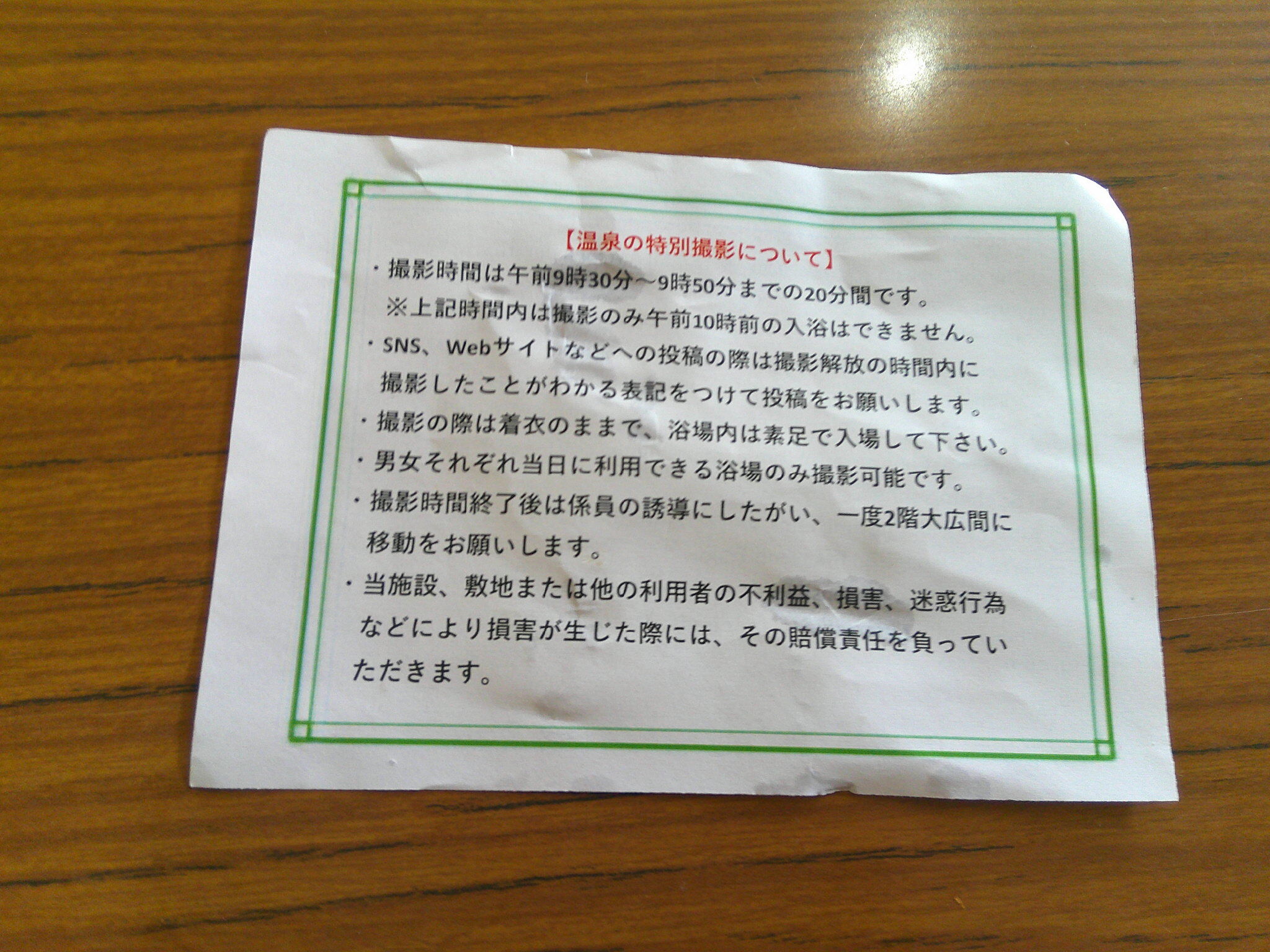 9時30分になったらスタッフがドアを開けてくれる。受付で入浴料を払って注意事項の紙を渡される。
