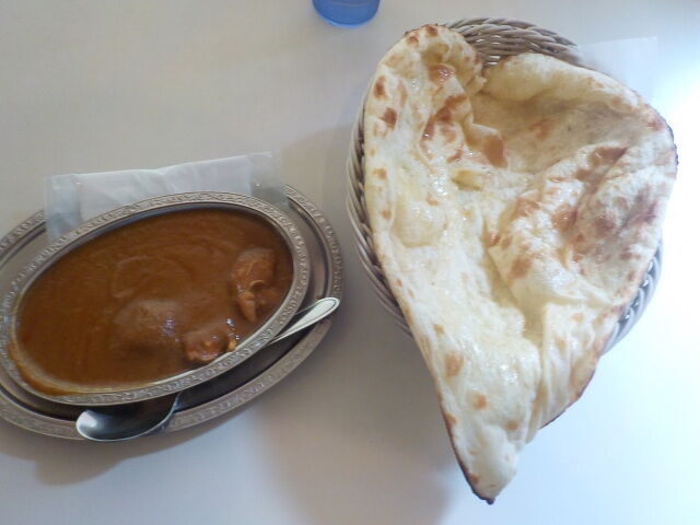 チキンカリー(ナン付き)・中辛。食べ終わったら食器類は返却口に返す。