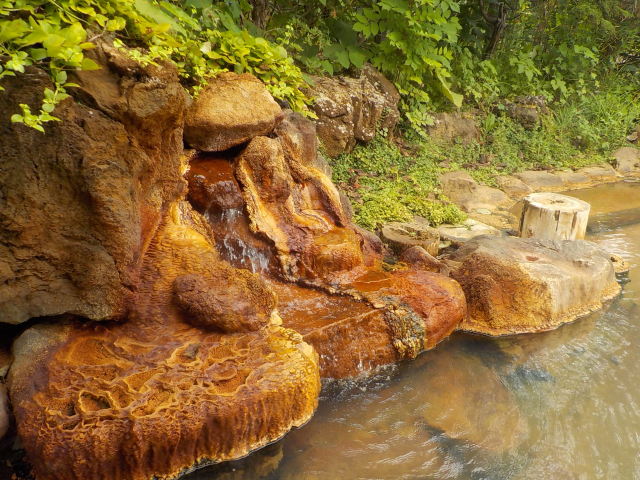 笹濁色で半透明の湯。水深は約90cm。大きな岩の上部から約20ℓ/分落水している。知覚的には、金気臭、金気・炭酸味。溢れた湯は湯縁からオーバーフローしている。湯温はやや熱め。滑らかな肌触りでツルスベの浴感だが、微妙にキシキシ感も感じられる。