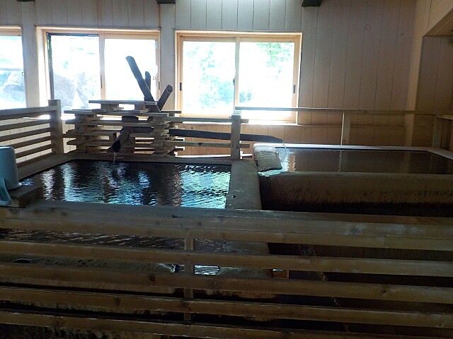 ヒバの木で造られた湯温の違う2つの浴槽。