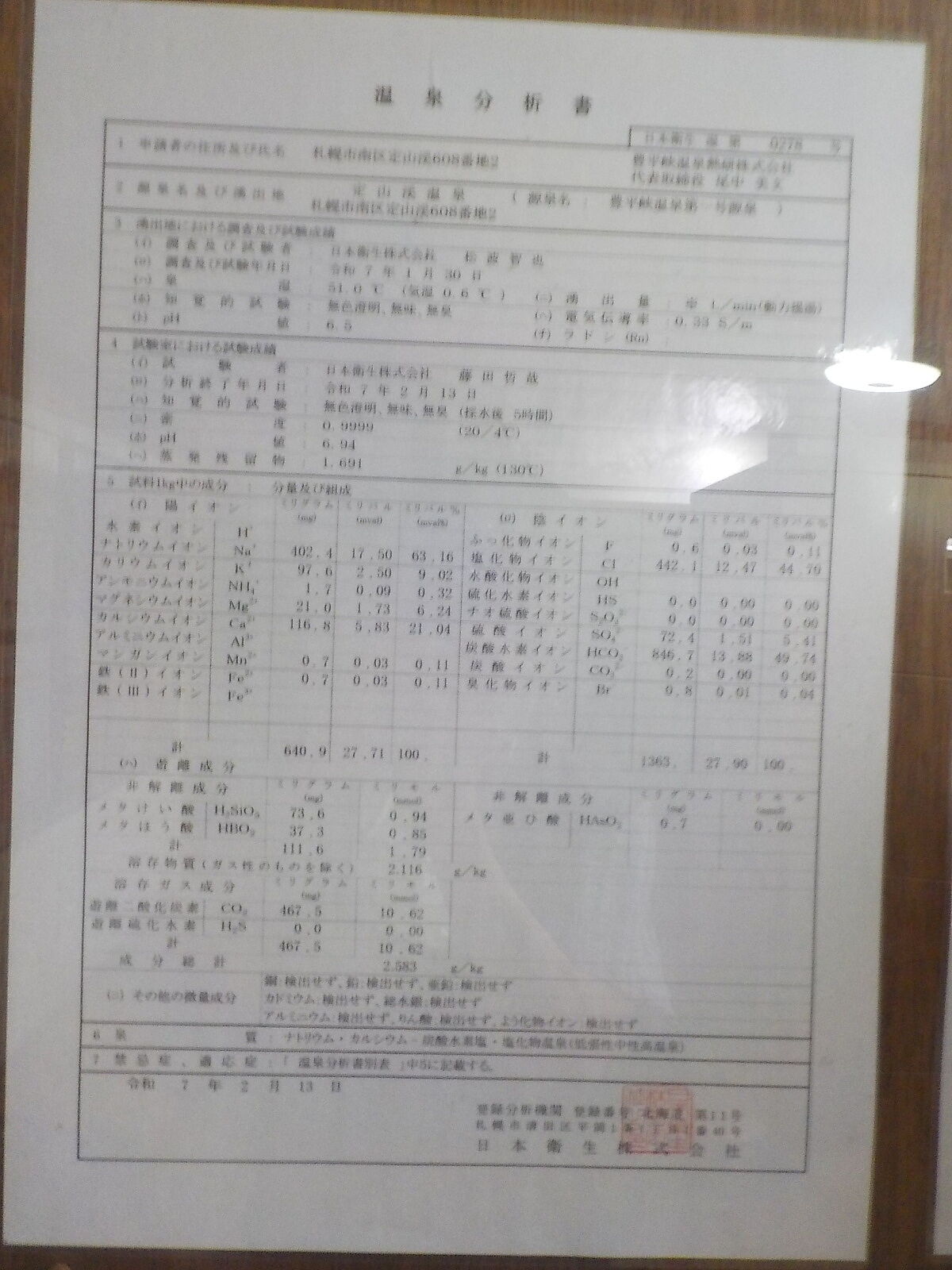昭和62年7月9日に作成した温泉分析書(北海道薬剤師会公衆衛生検査センター)。泉温:51.5℃(気温:28.5℃)、湧出量:451ℓ/分(動力)、pH値:7.0、溶存物質:2.346g/kg、成分総計:2.521g/kg、泉質:ナトリウム・カルシウム-炭酸水素塩・塩化物泉(低張性中性高温泉)(旧泉質:含土類‐重曹泉)