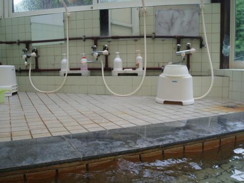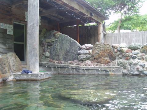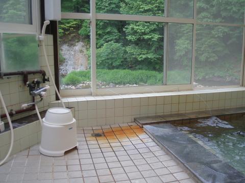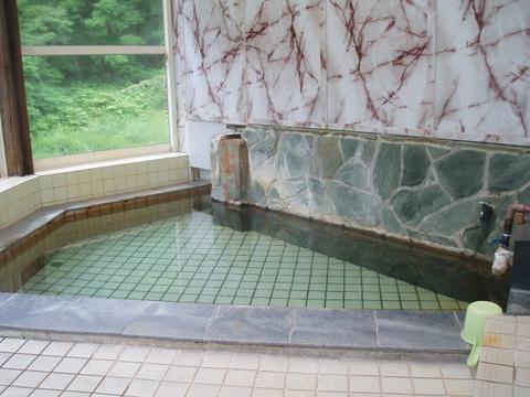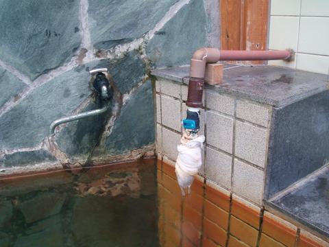 ほとんど無色透明の湯船の先のほうで女湯と繋がっている。管端に布の巻いた湯口から74.1℃(計測時以下略)、pH7.9(50℃以下に自然冷却したpH計測)の湯がレバー調整で約20ℓ/分程度注いでいる。知覚的には、微弱硫化水素臭・微弱塩味。湯張りの途中らしく従業員からかなり熱いので水を入れるようにと指示を受ける。ちなみに、湯船の中ほどで湯温48.5℃、pH8.0を計測。やはりこの状態では熱すぎて入浴できないので加水蛇口を開放して加水する。溢れた湯は湯縁切れ目からオーバーフローしている。熱いので加水蛇口で加水する可能性あり。夏季は加水掛け流しと査定。とに角、熱いという印象である。
