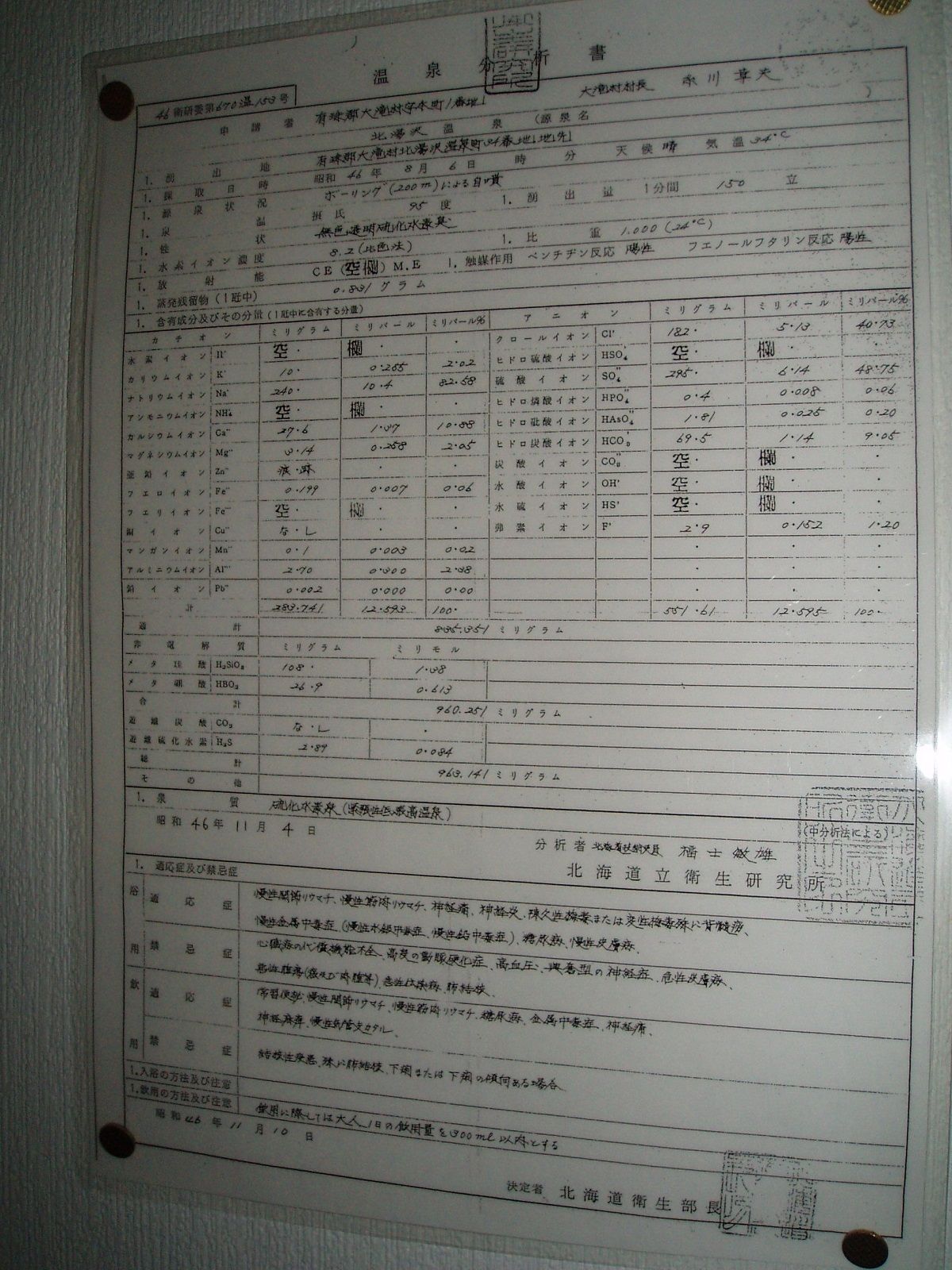 昭和46年11月10日に作成した温泉分析書(北海道立衛生研究所)。泉温:95℃(気温:5℃)、湧出量:150ℓ/分、pH値:8.2、溶存物質:0.960g/kg、成分総計:0.963g/kg、泉質:硫化水素泉(緊張性低張高温泉)