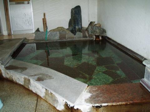 ほとんど無色透明の湯船に湯口から65.2℃(計測時以下略)、pH8.3(50℃以下に自然冷却してpH計測)の湯が約5ℓ/分程度注いでいる。硫化水素泉だが、知覚的には微弱塩味・ほとんど無臭。湯船の中ほどで、湯温44.4℃、pH8.3を計測。溢れた湯は湯縁からオーバーフローしている。湯口温度の65.2℃は露天風呂の80℃超と比べて低温だが、流速による熱損失を考慮しても加水しているのだろうか。湯客が加水蛇口で加水する可能性もある。露天風呂のほうが魅力あるので、内風呂でじっくり湯浴みという客はほとんどいないと思われる。