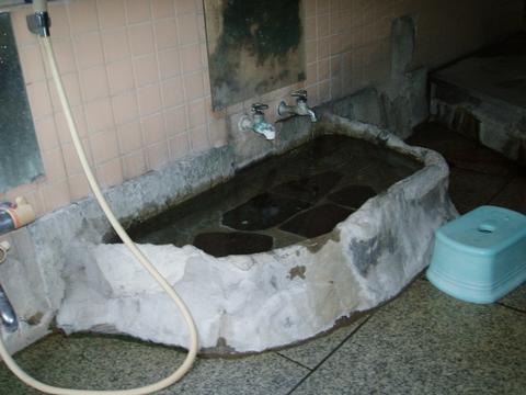 こじんまりした浴室に小浴槽が一槽。洗い場には、シャワー付カラン1台と汲み湯のみ。シャンプー・石鹸あり。
