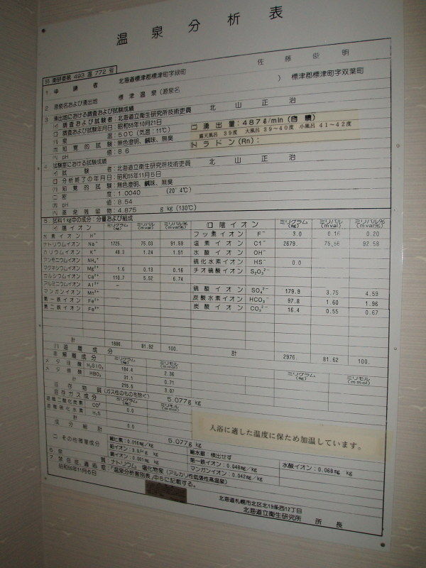 昭和56年11月6日に作成した温泉分析書(北海道立衛生研究所)。泉温:50℃(気温:11℃)、湧出量:487ℓ/分(自噴)、pH値:8.6、溶存物質:5.077g/kg、成分総計:5.077g/kg、泉質:ナトリウム-塩化物泉(アルカリ性低張性高温泉)(旧泉質名:弱食塩泉)