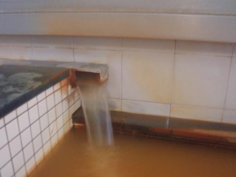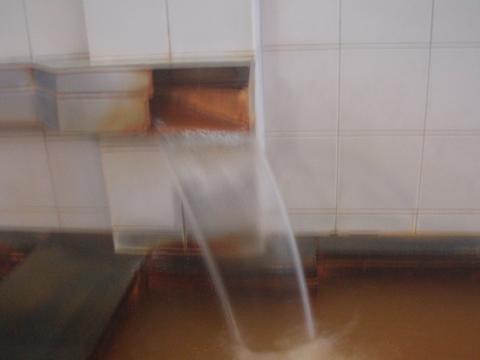 湯口から44.8℃(計測時以下略)、pH7.8の循環湯が注いでいる。知覚的には、微弱金気臭、金気味。