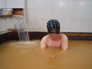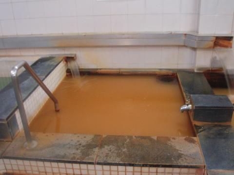 黄土色の濁り湯でほとんど不透明の小浴槽。湯口から46.3℃、pH7.5の湯が注いでいる。加水蛇口のハンドルははずされていて使用不可。