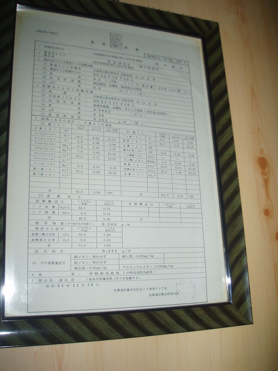 昭和61年11月10日に作成した温泉分析書(北海道立衛生研究所)。泉温:9.4℃(気温:7℃)、