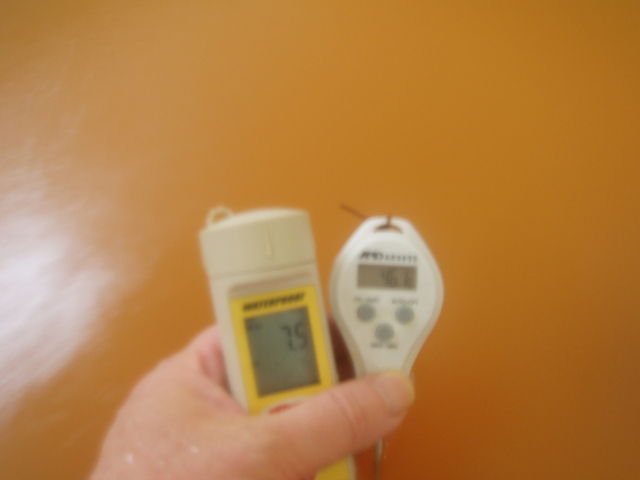 湯船の中ほどで、湯温46.1℃、pH7.5を計測。溢れた湯は湯縁排湯口から排湯している。湯船の中には循環吸込み口は確認できない。真湯と異なり塩素薬剤臭は感知されず。計測以上の劇熱で身を沈めることができるのは湯口温度が一瞬低下したときがチャンスであった。
