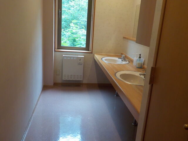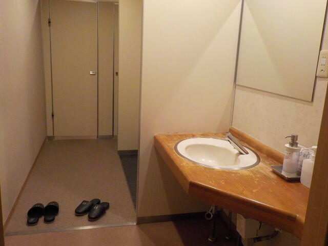 化粧室。歯磨き用の紙コップは置いていない。