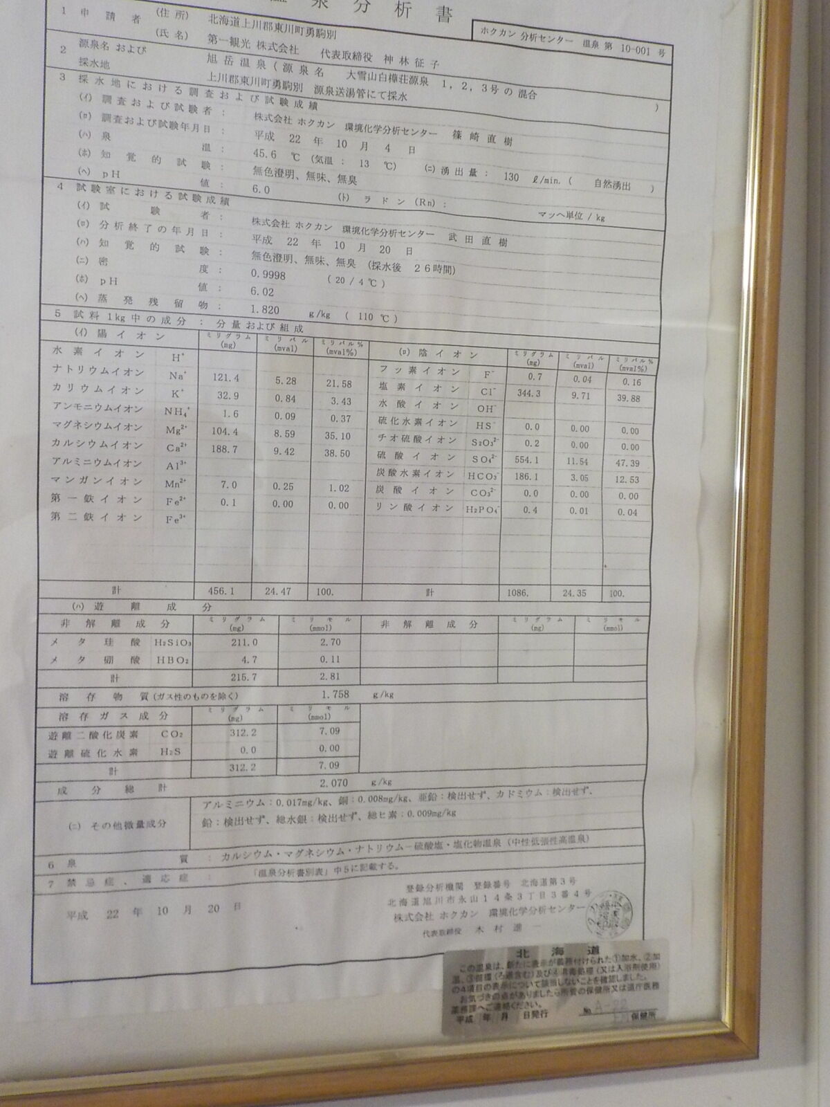 平成22年10月20日に作成した温泉分析書(ホクカン環境化学分析センター)。泉温:45.6℃(気温:13℃)、湧出量:130 ℓ/分(自然湧出)、pH値:6.0、溶存物質:1.758g/kg、成分総計:2.070g/kg、泉質:カルシウム・マグネシウム・ナトリウム-硫酸塩・塩化物泉(中性低張性高温泉)(旧泉質名:含食塩-正苦味-石膏泉)