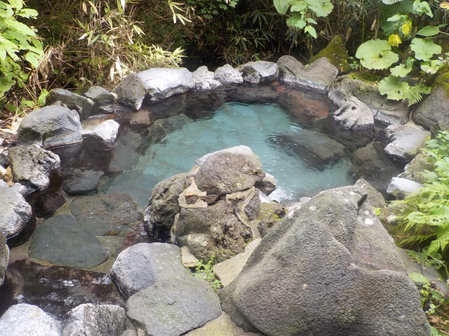 大きな岩に囲まれた露天風呂は野湯のような雰囲気である。降り口が不安定で注意を要する。