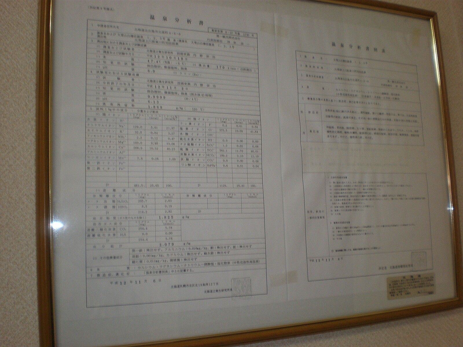 平成12年11月6日に作成した温泉分析書(北海道立衛生研究所)。泉温:47.4℃(気温:-6℃)、