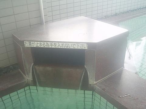 青いタイルで青みを帯びて見えるが、ほとんど無色透明の湯。湯口から38.6℃(計測時以下略)、pH8.6の湯が約40ℓ/分ほど注いでいる。知覚的には、微弱硫化水素臭、ほとんど無味。