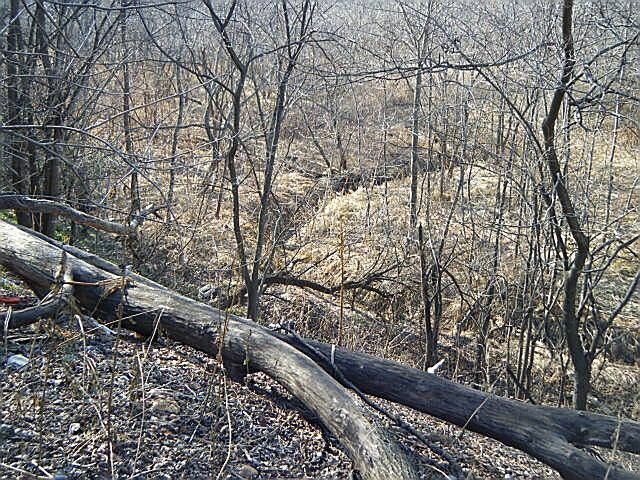 11月下旬、雑木林の梢は葉を落とし季節は晩秋から初冬に差し掛かっていた。途-1泉源横のダート道を少し歩いていくと右手に風倒木があり、急斜面の下の窪み辺りからなにやら水の音が聴こえてくるではないか。ところどころに不法投棄の残骸が散乱している急斜面を駆け下りてみた。