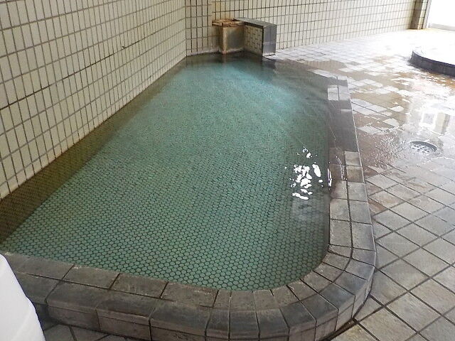 ほとんど無色透明の湯。箱入りの湯口に布製の袋を被している。注湯量は約10ℓ/分。知覚的には、硫化水素臭、塩味。溢れた湯は仕切り壁の湯孔から小浴槽側に流れている。横に長い湯船なので湯口周辺が熱い。つるすべの浴感あり。