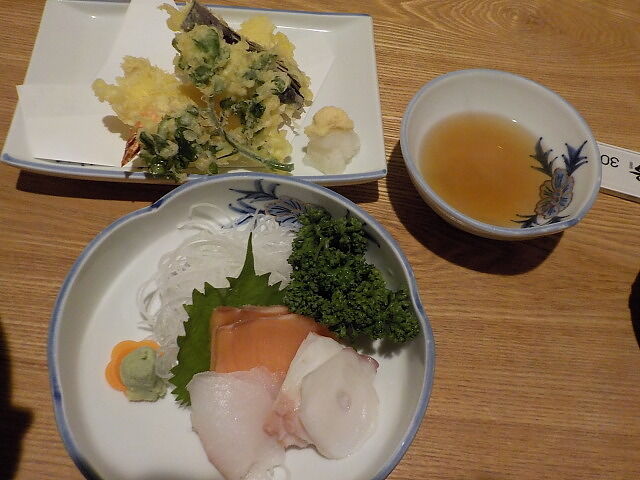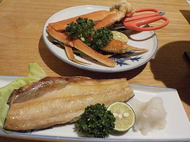 海鮮焼き、煮物、3点盛り、タラバ蟹の脚、焼き魚(ホッケ)、天ぷら、刺身、ご飯、味噌汁、漬物、メロン。天ぷらと焼き魚は着席してから提供する。