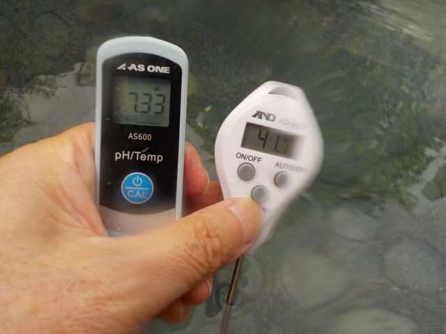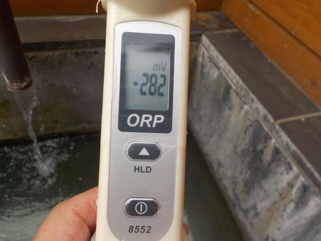湯口:温度49.5℃、pH6.85、ORP値は-293mに収束した。