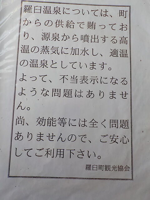 平成22年10月5日に作成した温泉分析書(北海道薬剤師会公衆衛生検査センター)。泉温:(混合68.2℃(気温:17.6℃)、湧出量:※ℓ/分(蒸気造成泉)、pH値:7.0、溶存物質:1.808g/kg、成分総計:1.854g/kg、泉質:含硫黄-ナトリウム-塩化物泉(低張性中性高温泉)(旧泉質名:含食塩-硫黄泉)
