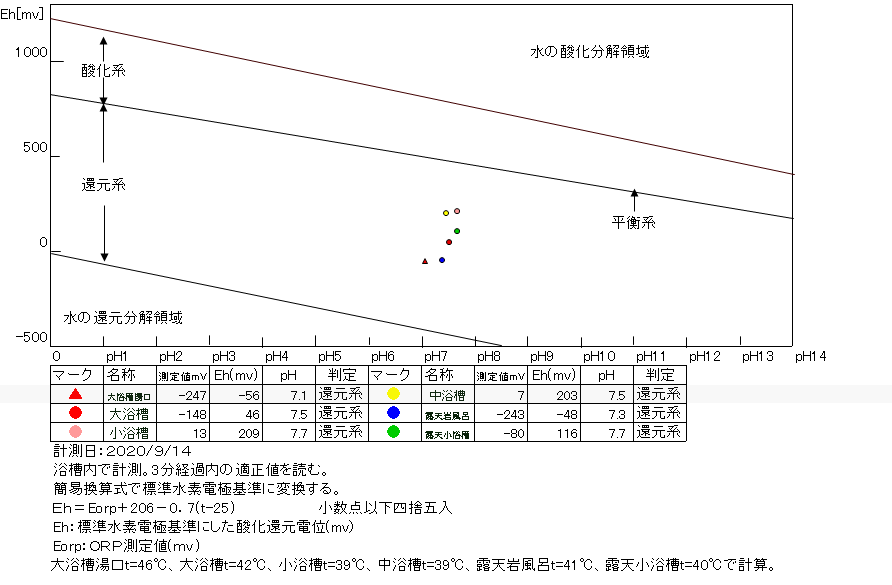 湯口:温度45.7℃、pH7.05、ORP値は-247mに収束した。
