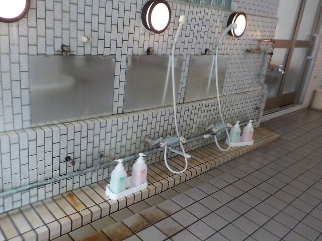 タイル張りの浴室に、大浴槽、小浴槽、中浴槽を配置。シャワー付カラン5台、シャンプー・ボディソープあり。