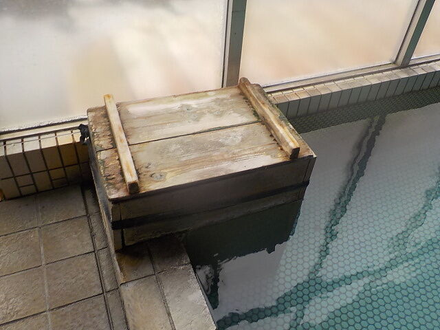 岩風呂に隣接したフラットな小浴槽。ほとんど無色透明の湯。注湯量は約10ℓ/分。知覚的には、露天岩風呂に準ずる。溢れた湯は排湯管から排湯している。白い湯の華が目立つ。