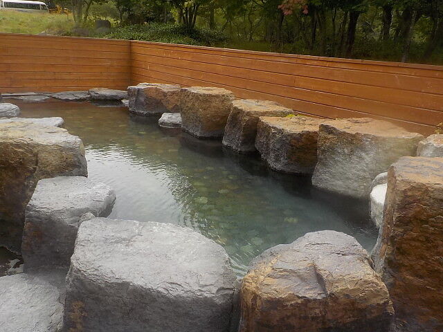 三方を大きな岩で囲まれた岩風呂。注湯量は約10ℓ/分。知覚的には、硫化水素臭、塩味。溢れた湯は湯縁からオーバーフローしている。つるすべ感有り。内風呂と違い袋で濾過されていないので白い湯の華が目立つ。