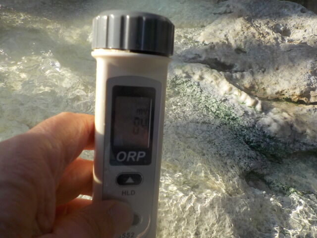 2021/12/13、9時頃、足湯内でORP計測。源泉100%掛け流しで、塩素系薬剤未使用。