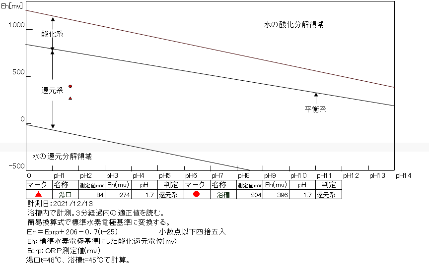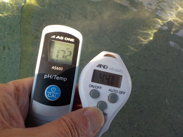 浴槽:温度44.6℃、pH1.72、ORP値は204mvに収束した。