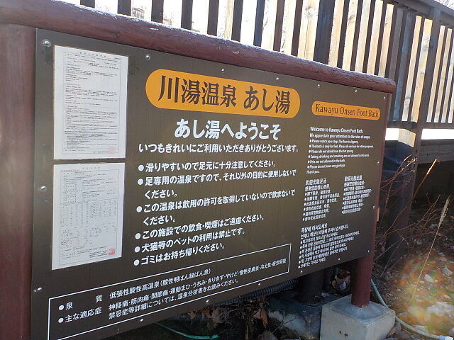 「川湯公衆浴場」の向かい側にある川湯園地に足湯がある。平成14(2009)年に整備された足湯は観光客の立ち寄りスポットになっている。再訪時、手湯はロープが張られて立ち入り禁止になっていた。