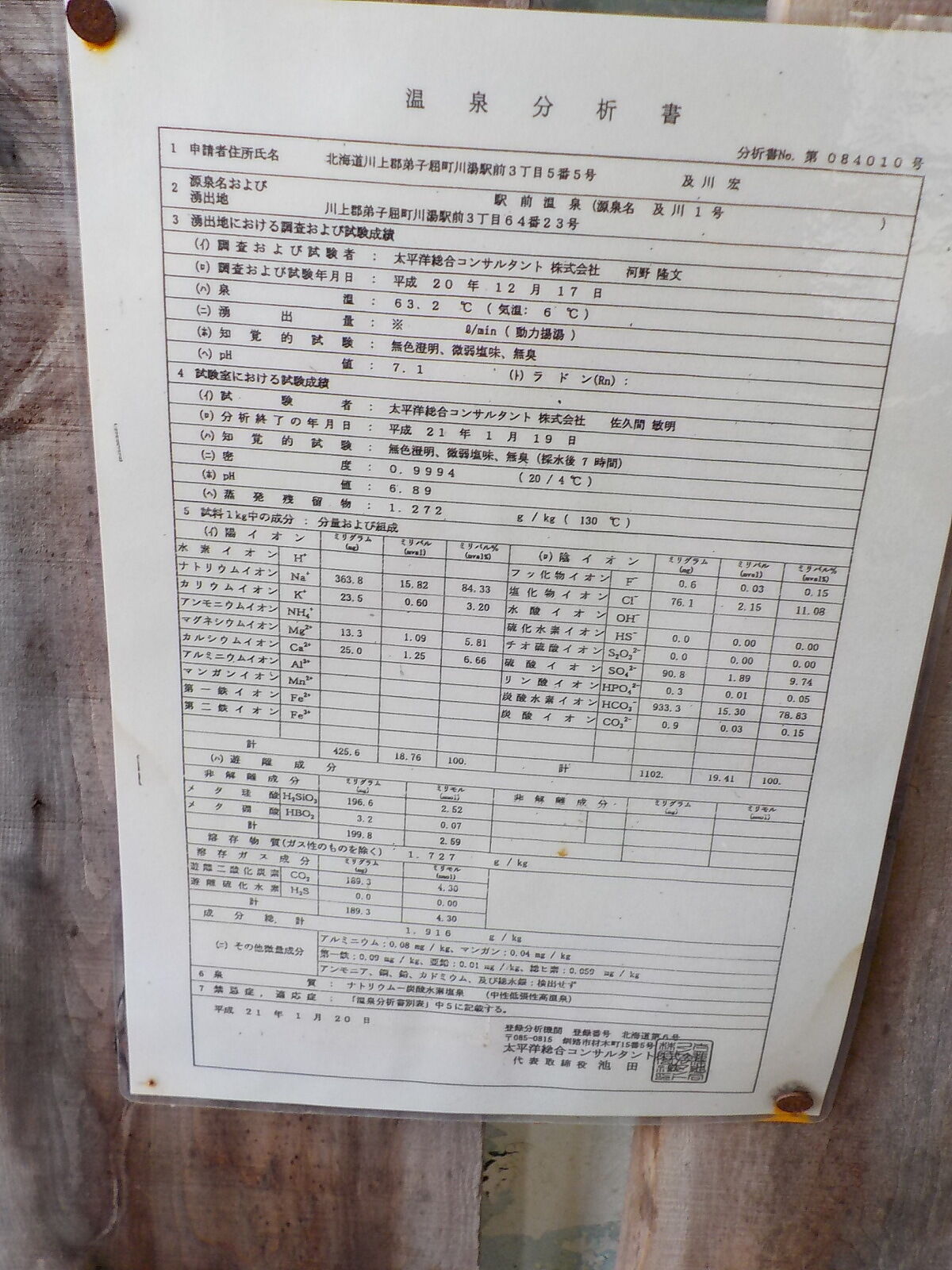 平成21年1月20日に作成した温泉分析書(太平洋総合コンサルタント㈱)。泉温:63.2℃(気温:6℃)、湧出量:※ℓ/分(動力揚湯)、pH値:7.1、溶存物質:1.727g/kg、成分総計:1.916g/kg、泉質:ナトリウム-炭酸水素塩泉(中性低張性高温泉)(旧泉質名:重曹泉)