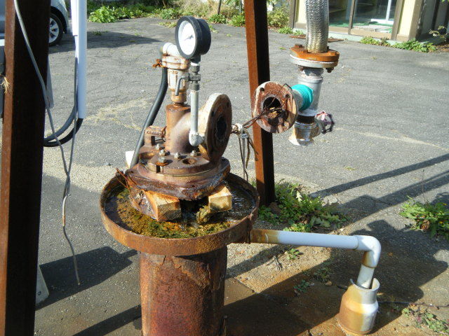 正面玄関前の源泉井汲み上げ管はエルボー管のところで取り外してある。