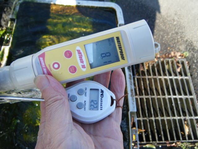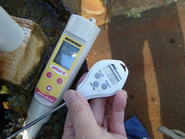 計測してみると、泉温12.2℃、pH8.1をマーク。アルカリ性のまろやかな喉越し。保健所許可はないので、400mの地下水とはいえ、飲用としては煮沸したほうが無難かも(貯水タンク及び配管に細菌が付着しやすい為)。