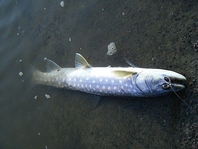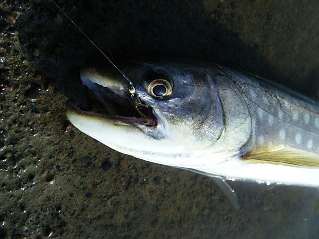 キャストしてみると、面白いようにヒットして入れ食い状態。体長40cm前後のアメマスが20尾オーバーヒットして、腕が痛くなり1時間くらいで納竿した。アメマスの群れは移動を繰り返すので、翌日もここにいるとは限らない。