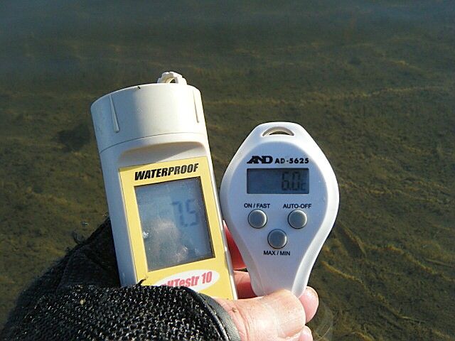 16時18分の計測で、水温6.0℃、pH7.5。主なヒットフライはビーズニンフ#12。